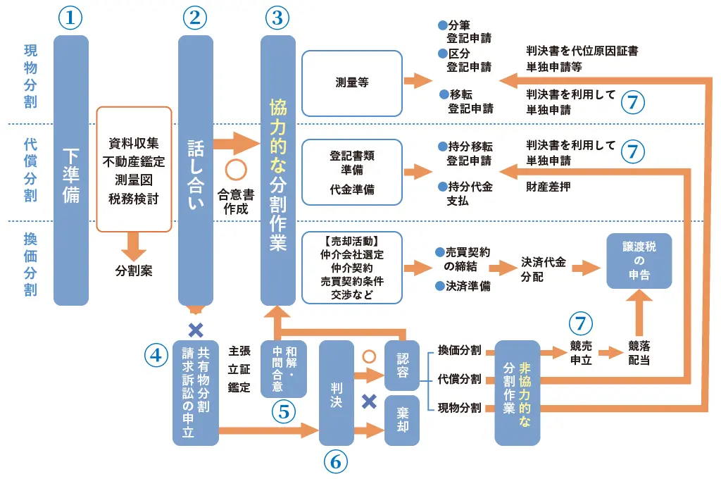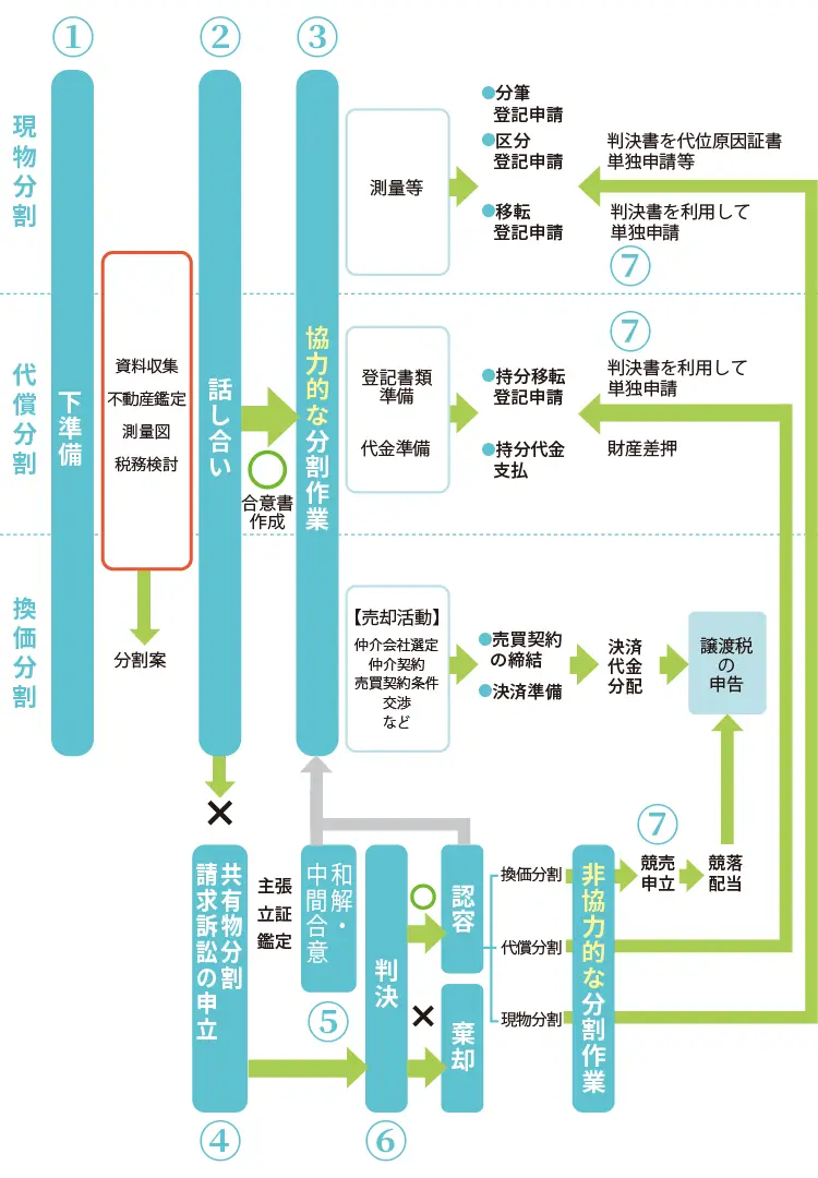 ここでは、共有物分割がどのように進んでいくのか、その流れをご説明します。